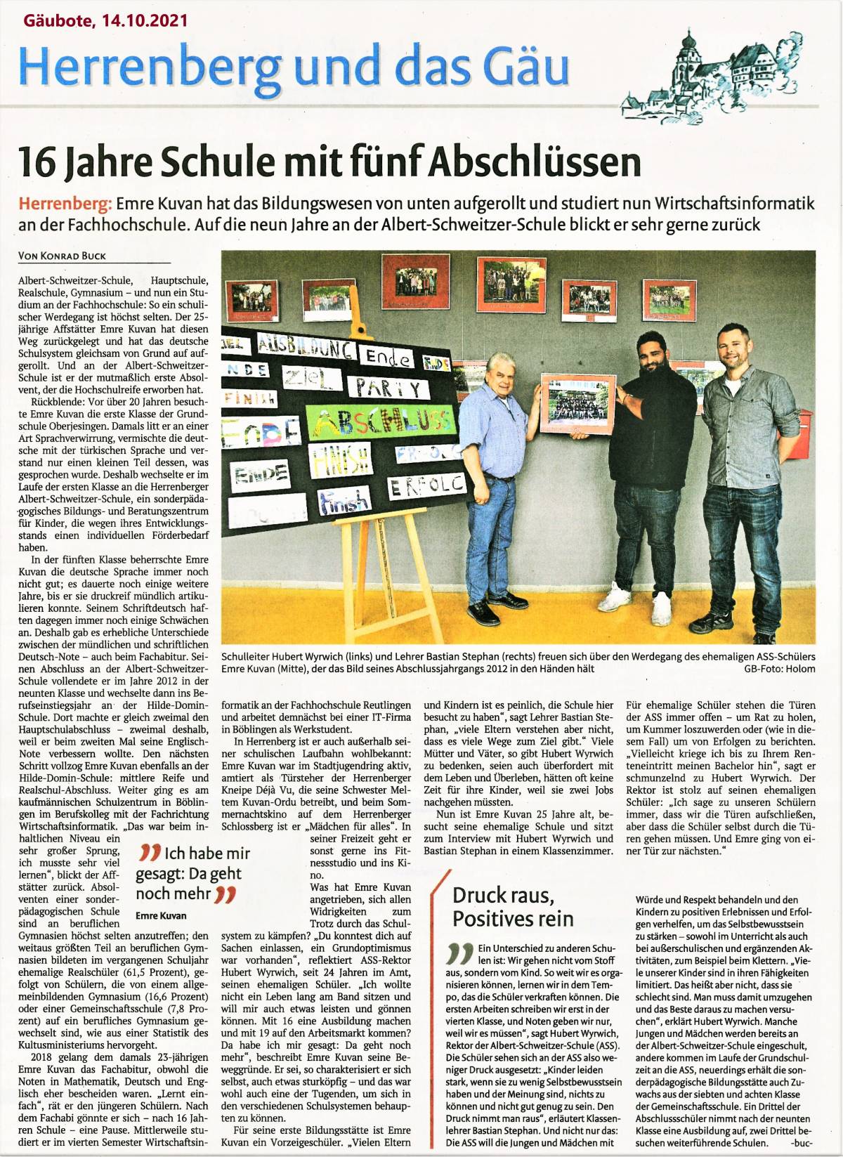 Ich kam damals von der Grundschule in die zweite Klasse an die ASS. Die Schulzeit hat mir sehr viel Spaß gemacht. Ich wurde gut durch die Lehrer/innen unterstützt, aber es war natürlich auch nicht immer leicht. Die Lehrer/innen haben immer an mich geglaubt. Ich wurde gut gefördert und durch sie motiviert.