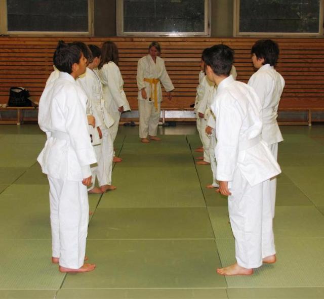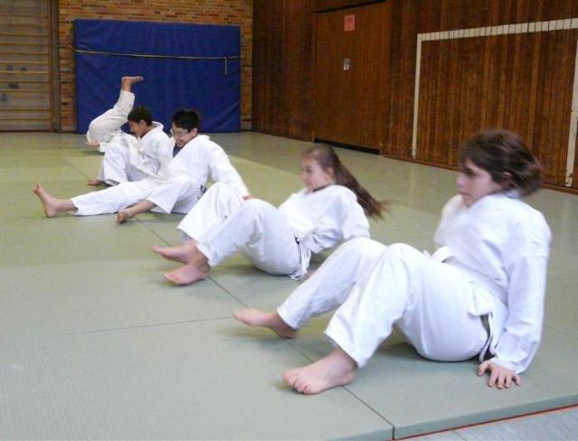 - Fallschule: nach hinten („Igel“) und nach vorne fallen, Judorolle